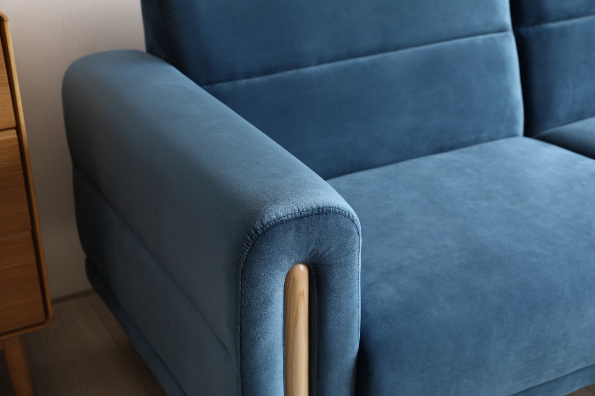 The gorgeous naturally finished hardwood vertical accents are a beautiful contrast to the soft fabric upholstery. Micro-suede fabric.