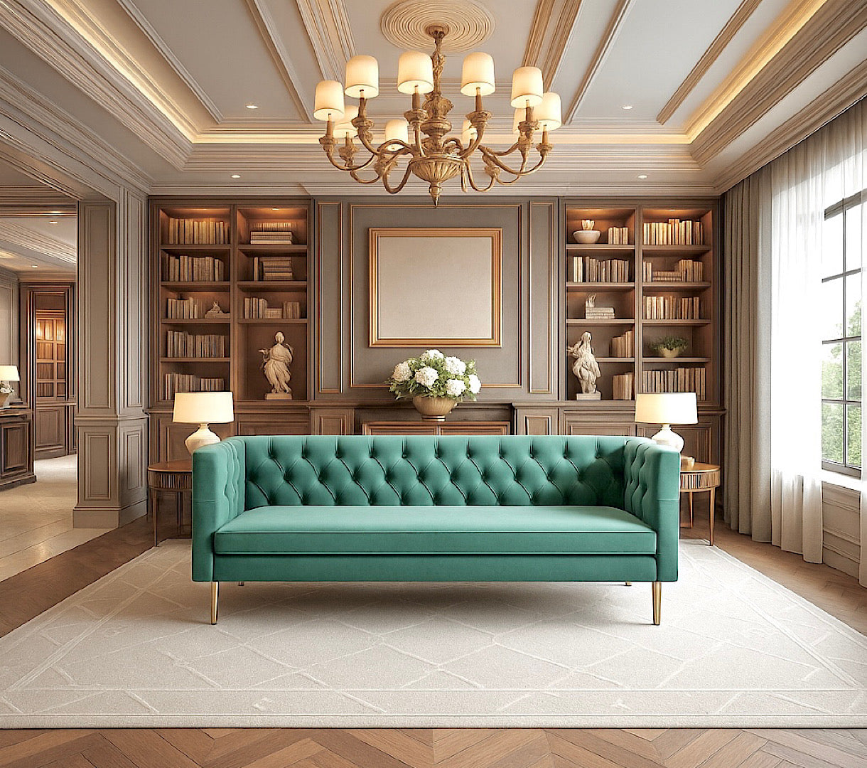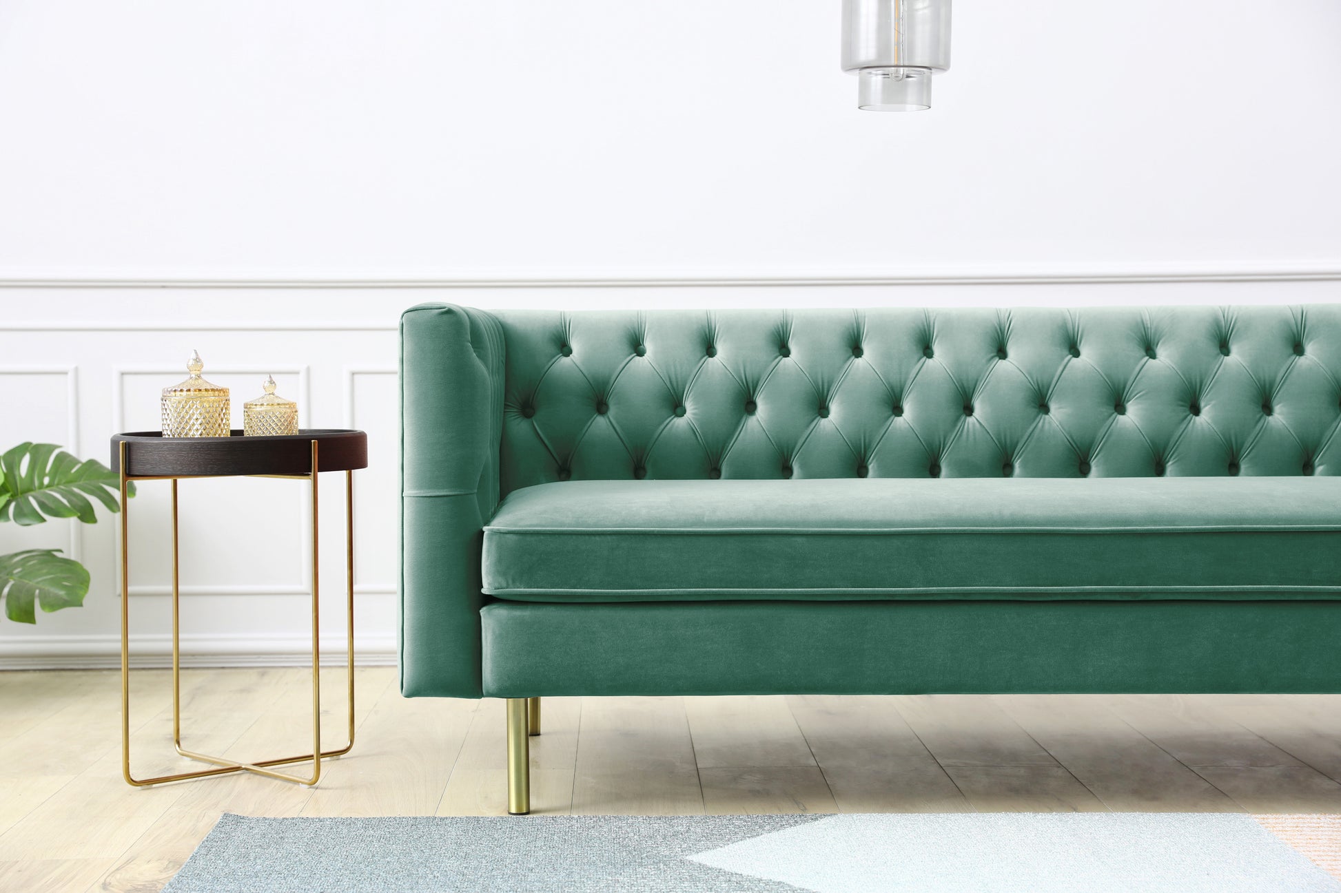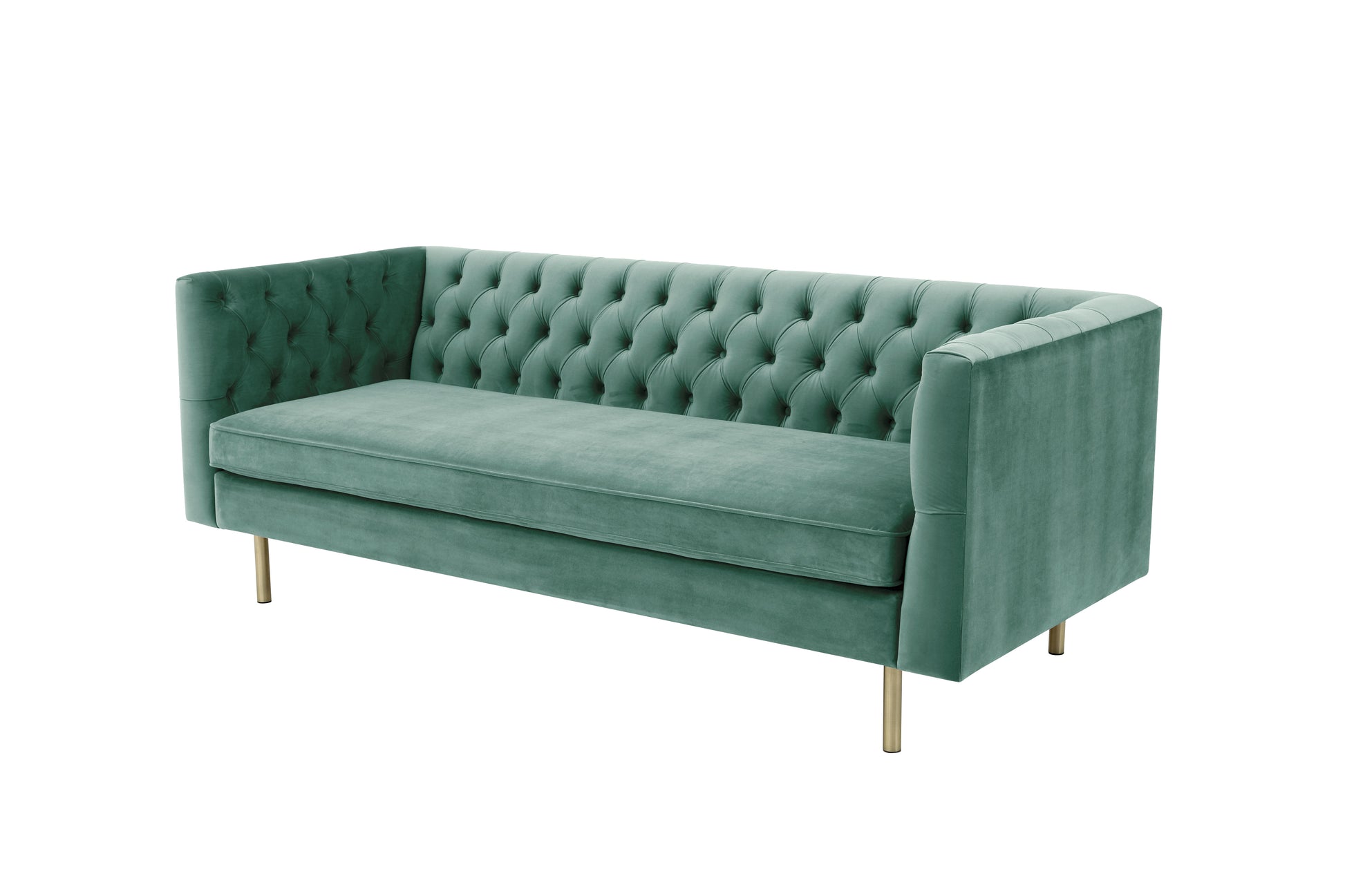 This beautiful tufted 3 seater seater sofa will bring out the unique aura of your space. The eucalyptus colour along with the brass legs will add a pop of colour to any room.